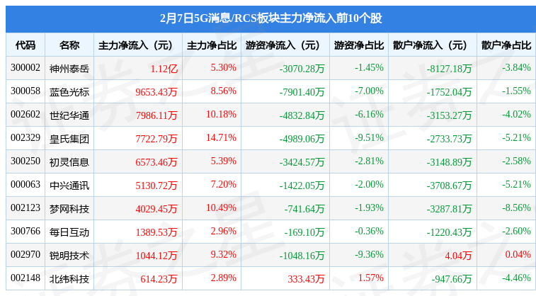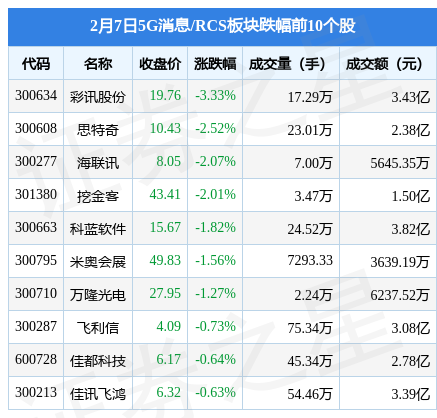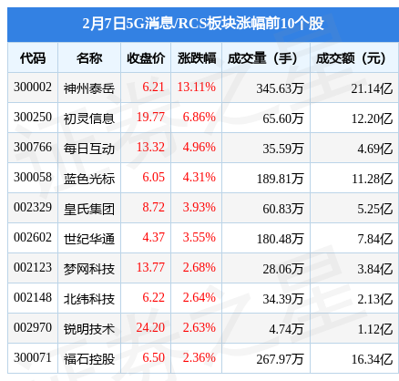 2月7日5G消息/RCS板块较上一交易日上涨1.6%,神州泰岳(300002)领涨。当日上证指数报收于3248.09,上涨0.29%。深证成指报收于11926.88,上涨0.12%。5G消息/RCS板块个股涨跌见下表:
