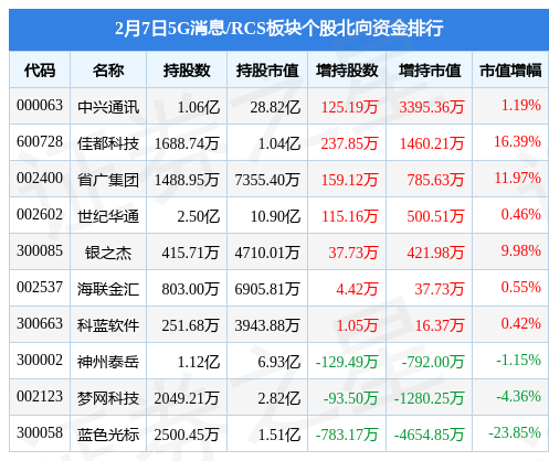 北向资金方面,当日5G消息/RCS板块北向资金持股市值为54.33亿元,减持109.31万元。其中增持最多的是中兴通讯,增持了0.34亿元。减持持最多的是蓝色光标(300058),减持了0.47亿元。5G消息/RCS板块北向资金持股变动明细见下表: