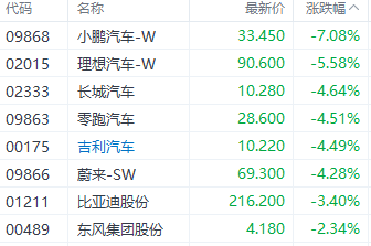 截至发稿,小鹏汽车-W(09868.HK)跌7.08%、理想汽车-W(02015.HK)跌5.58%、零跑汽车(09863.HK)跌4.51%、蔚来-SW(09866.HK)跌4.28%、比亚迪(002594)股份(01211.HK)跌3.40%。