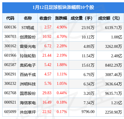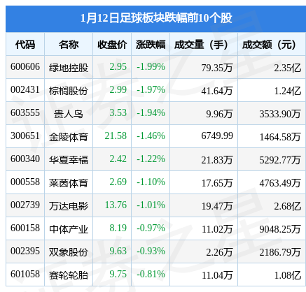 1月12日足球板块较上一交易日下跌0.32%,绿地控股(600606)领跌。当日上证指数报收于3163.45,上涨0.05%。深证成指报收于11465.73,上涨0.23%。足球板块个股涨跌见下表: