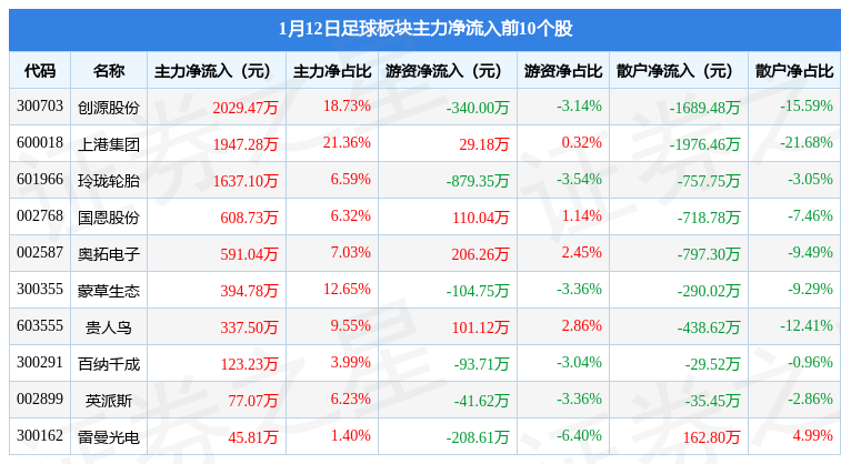 从资金流向上来看,当日足球板块主力资金净流出7426.52万元,游资资金净流入2297.84万元,散户资金净流入5128.68万元。足球板块个股资金流向见下表: