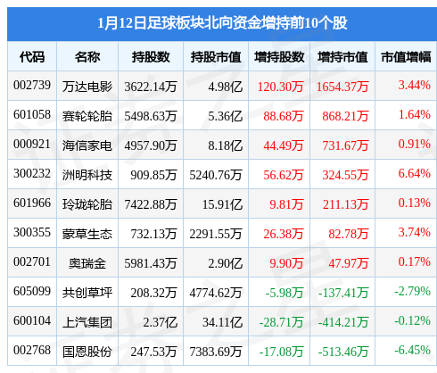 北向资金方面,当日足球板块北向资金持股市值为86.92亿元,增持787.85万元。其中增持最多的是万达电影(002739),增持了0.17亿元。减持持最多的是上港集团(600018),减持了0.21亿元。足球板块北向资金持股变动明细见下表: